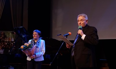 Następnie dyrektor Włodzimierz Taboryski opowiadał o powstaniu Stowarzyszenia Sztuka-Edukacja-Promocja oraz o początkach liceum. Podziękował członkom pierwszego zarządu i wręczył kwiaty pani Hannie Rek.